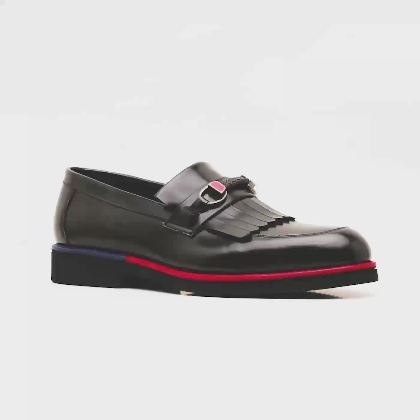 - Design: The loafers feature an elegant round toe, complemented by a striking buckle detail, and are finished with a playful contrast sole edge in red, adding a modern twist to a classic silhouette.