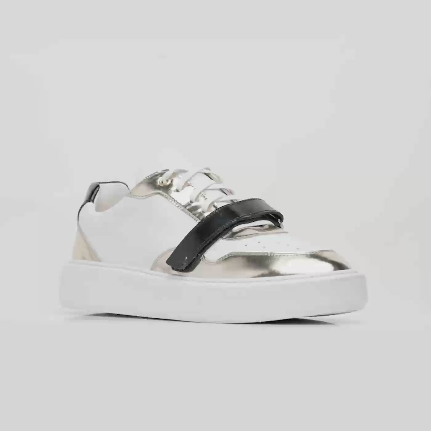 Design Detail: The sneakers boast a minimalist charm, enhanced by the subtle yet striking contrast of textures and the metallic accents that add a modern twist to a classic shape.
