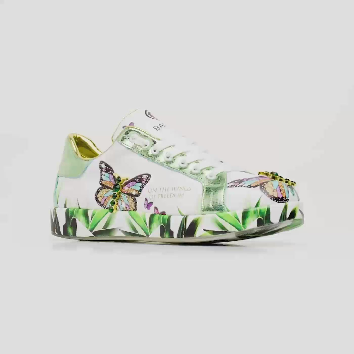 - Painting: Each pair features hand-painted details, making every sneaker unique, showcasing the phrase "On the wings of freedom" and vibrant butterfly illustrations.